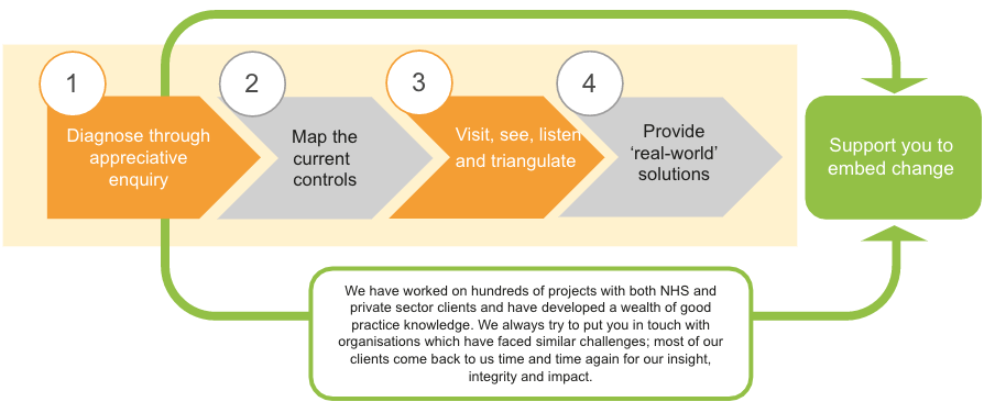 We use a range of tools and techniques to support our clients with their challenges or to support them to optimise their governance. We understand the importance of ensuring that our work is undertaken without undue stress on services or existing resources and we are experienced in knowing where to look and how to understand challenges quickly. Importantly, our work is collaborative and our aim is to help teams to develop rather than critique individuals. We follow the principles set out below through all of our work: